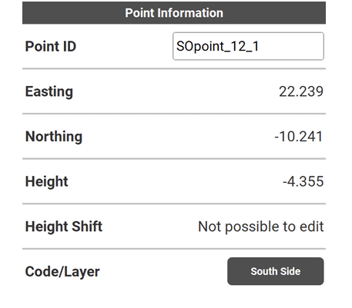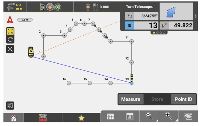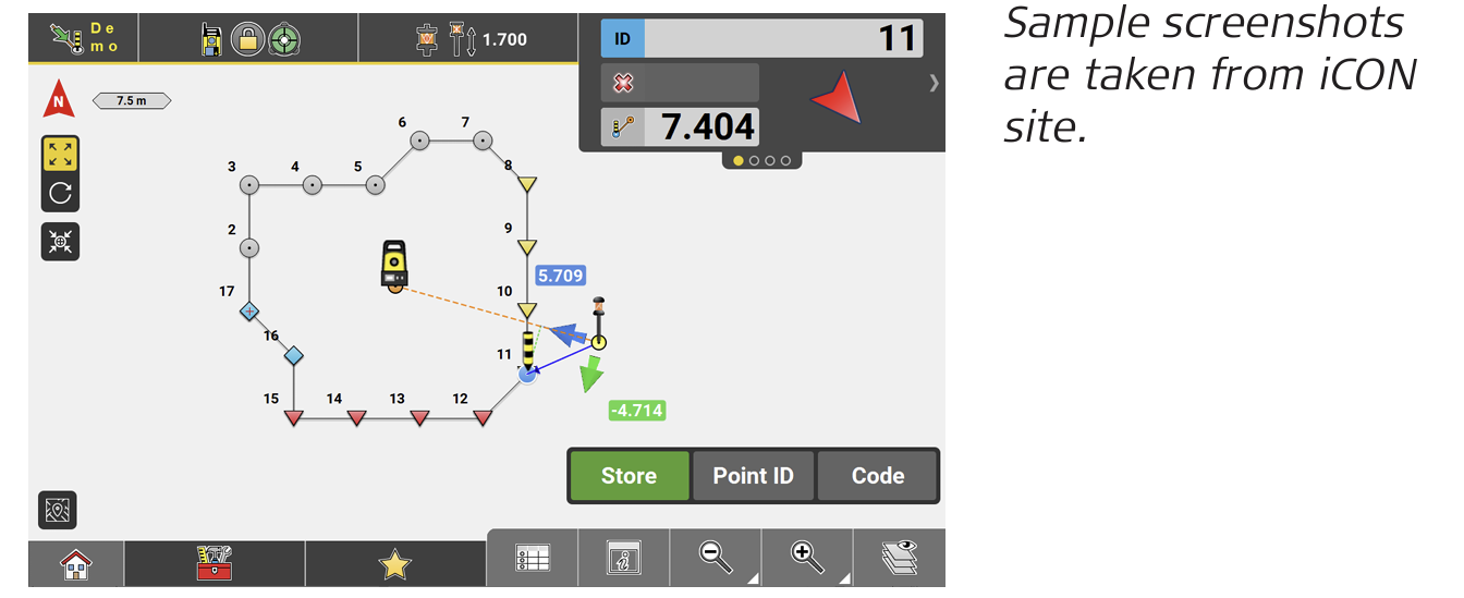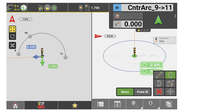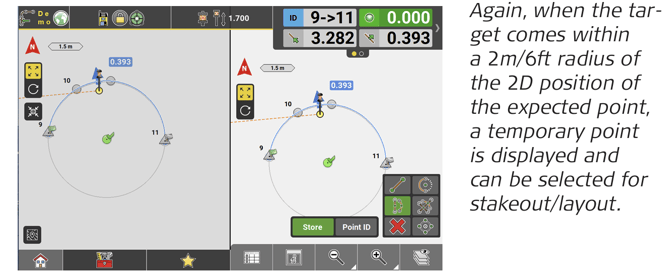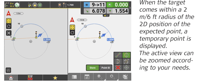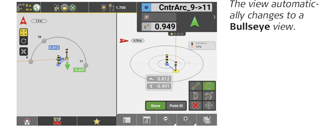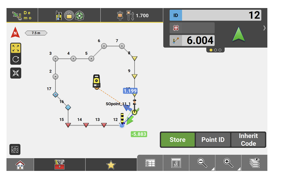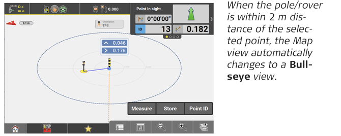 ↪ GNSS and Robotic Total Station approach: As the target moves around, real-time measurement data and guidance information is constantly displayed in the Information bar. Once the point in the screen turns green, the point is staked/laid out within tolerance. To record points using the Total Station, press Store. If using GNSS, press Measure.
