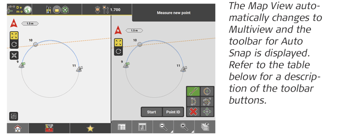 Auto Snap displays temporary points, that can be selected for stakeout/layout and added to a stakeout list. See also: Stakeout List function