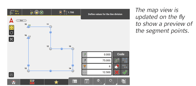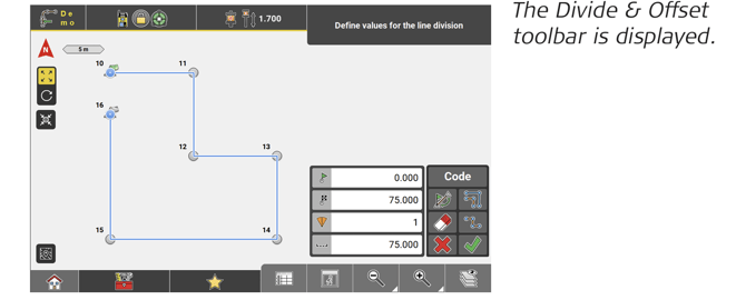 The toolbox function Divide & Offset allows you to divide a line or arc into segments. Based on a defined interval or number of segments, the function automatically creates segment points that can be staked out/laid out. These segment points can also be offset in one step.