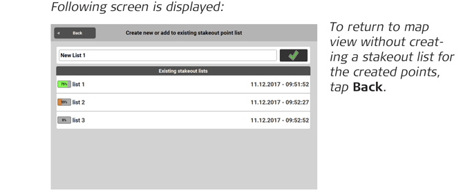 • To add the created points to an existing stakeout list, tap the respective row in the list.