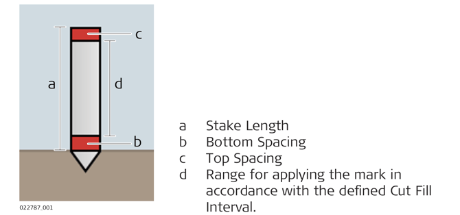 - Enter values for Bottom Spacing and Top Spacing in order to define a margin at the top and/or the bottom of the stake that shall not be available for marking. If the calculated Cut & Fill mark lies outside the given range, the system issues a notification. The bottom/top spacing can be set to 0, which implies that the whole length of the stake will be available for applying the mark. - Tap