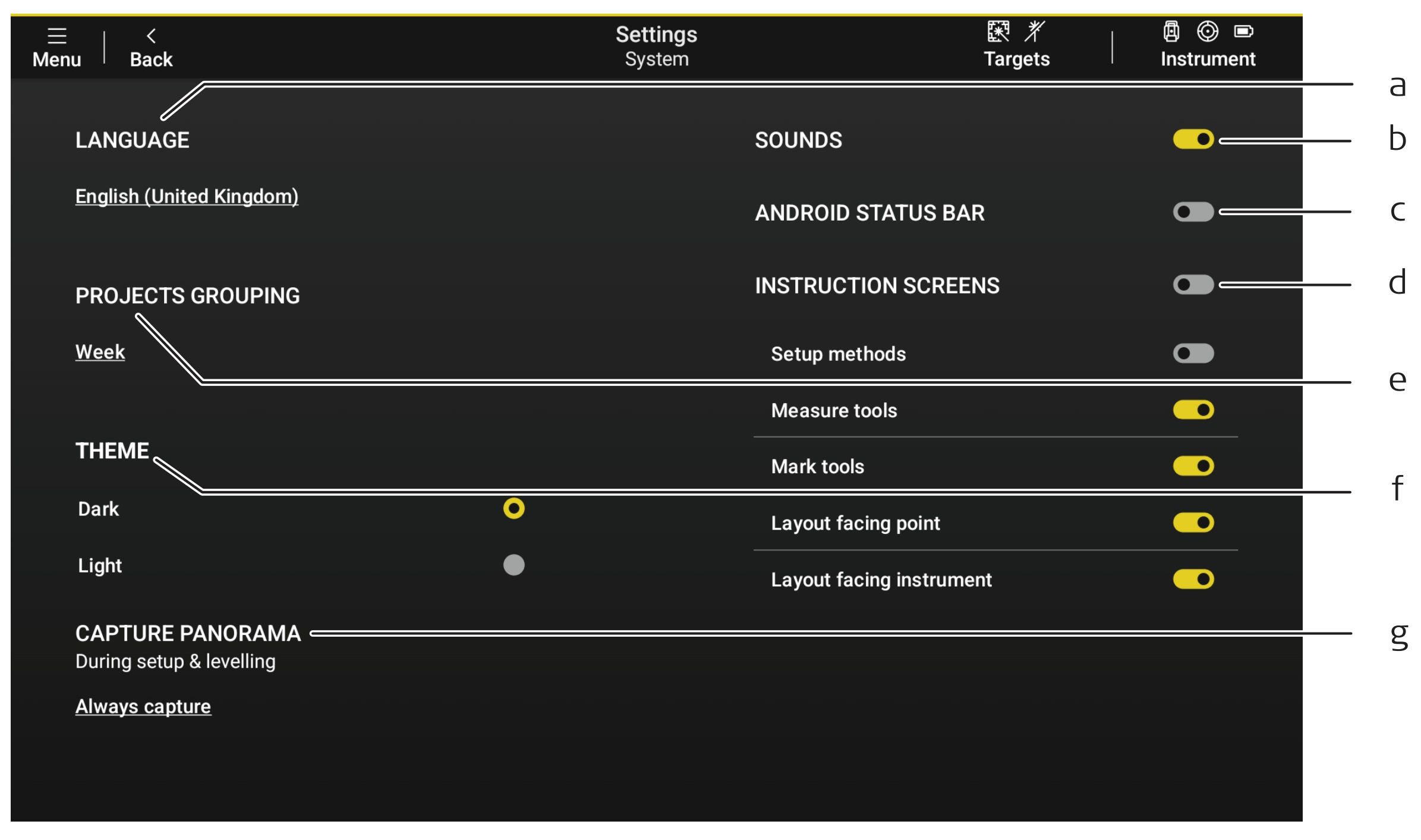 - Toggle among: Always ask, Never capture or Always capture settings regarding panorama capturing during setup and levelling routine.