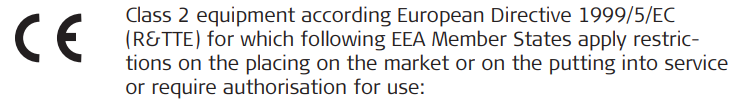 • This Class 2 equipment may be operated in: AT, BE, CY, CZ, DK, EE, FI, FR, DE, GR, HU, IE, IT, LV, LT, LU, MT, NL, PL, PT, SK, SI, ES, SE, GB, IS, LI, NO, CH, BG, RO and TR.
