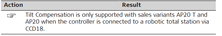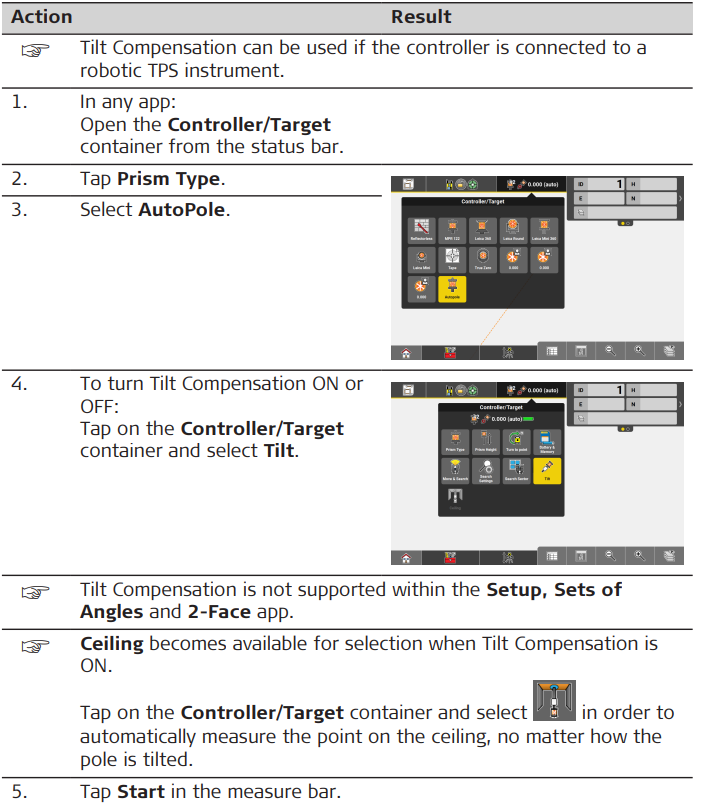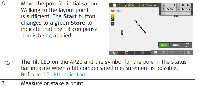 When measuring a point, the pole tip must be stable on the point while the pole should be in slight movement. Tilt compensation is indicated by an icon and the Tilt LED and is maintained by natural pole movement, for example while moving to the next point to be measured.