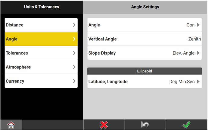 - For Angle select from Gon, Deg Min Sec, or Deg Dec.