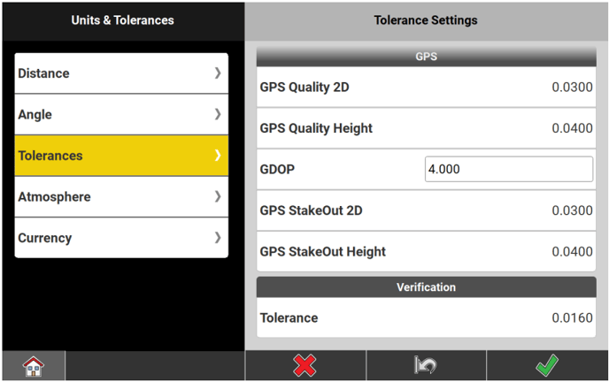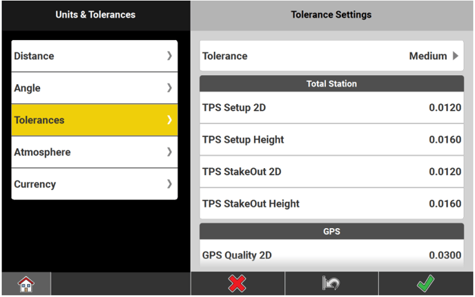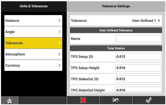 - To configure the units settings for Distance and Angle, go to Settings > Units & Tolerances from within the Home screen/Admin Panel.