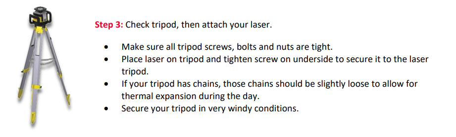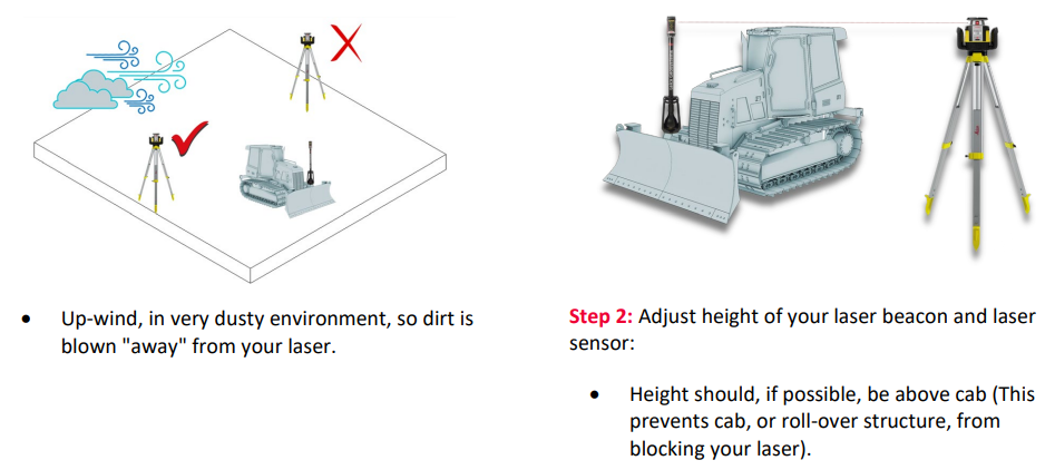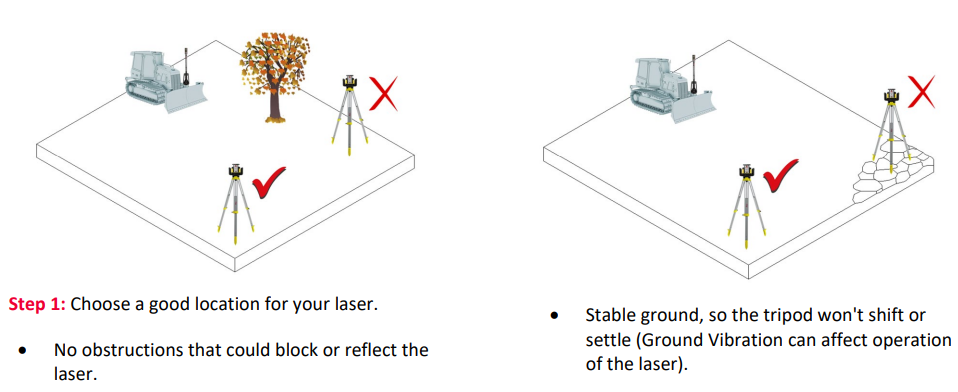 Set up a machine control laser for optimum coverage of the job site. It must be out of traffic and any obstructions. Position laser and tripod at a height equal to the laser receiver mounted on your machine, when it is on grade. Adjust alignment of your laser to the site as needed.