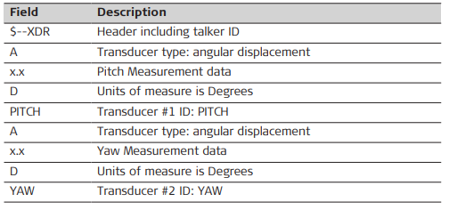 XDR – Transducer Measurements A.20 Syntax: $--XDR,A,x.x,D,PITCH,A,x.x,A,YAW*hh Description of fields Examples Standard Talker ID$GPXDR,A,0.071,D,PITCH,A,228.132,D,YAW*5E